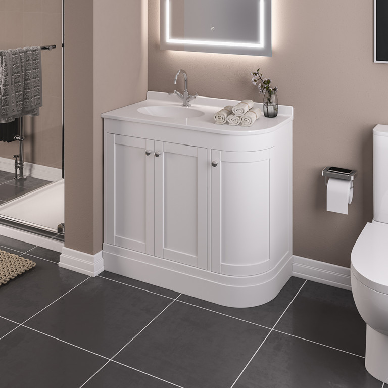 The Hardwick bathroom furniture features a luxurious basin design that flows seamlessly with the traditionally inspired curved lines and door panels of the vanity unit. Unit only, basin sold separately.