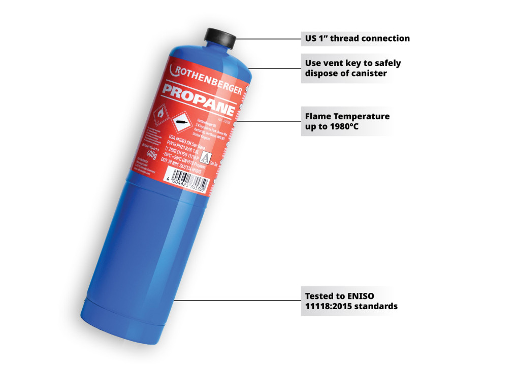 Containing industrial-grade gas within a tough, impact-resistant disposable steel cylinder, the Rothenberger Propane Disposable Gas Cylinder is fully compliant with ENISO 11118:2015 and fitted with a patented non-refillable valve designed to improve user safety. Additionally, the Rothenberger Propane Disposable Gas Cylinder are batch coded for traceability. Finally, the Rothenberger Propane Disposable Gas Cylinder can be used with other brand appliances with a similar thread and 1-inch US valve connections.