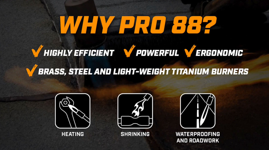 Heavy duty full lap roofing torch, ideal for drying, laying bitumen, field torching and other heat demanding application.