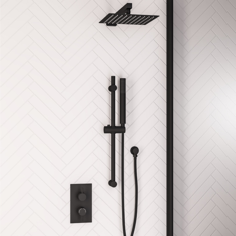Twin Valve, Square Shower Head Square Riser Kit, Outlet Elbow, Hose, Handset - Chrome