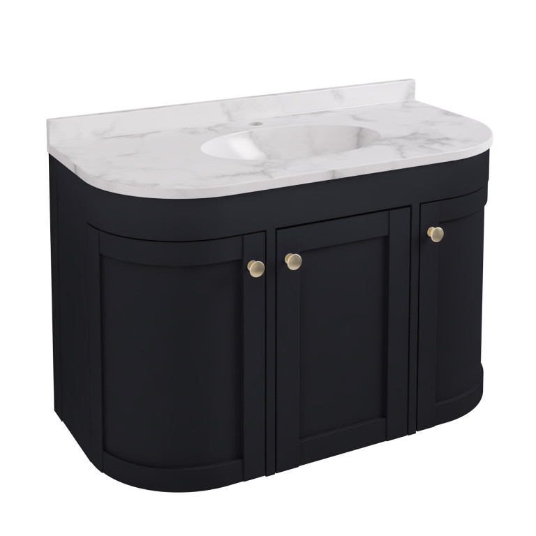 The Hardwick bathroom furniture with the traditionally inspired curved lines and door panels of the vanity unit.